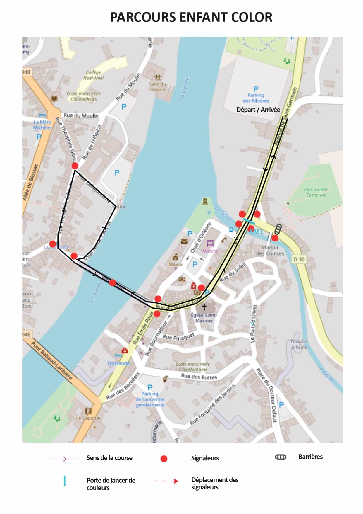 Les différents départs et arrivées se feront tous au CHAMP DU MONDE (Rte de St Germain de Confolens) suivi d’un parcours dans le centre-ville de CONFOLENS.